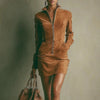 Elegancka, krótka sukienka w kolorze karmelowym, wykonana z imitacji zamszu, z stójką i zamkiem błyskawicznym z przodu, nadająca elegancki, nowoczesny wygląd.