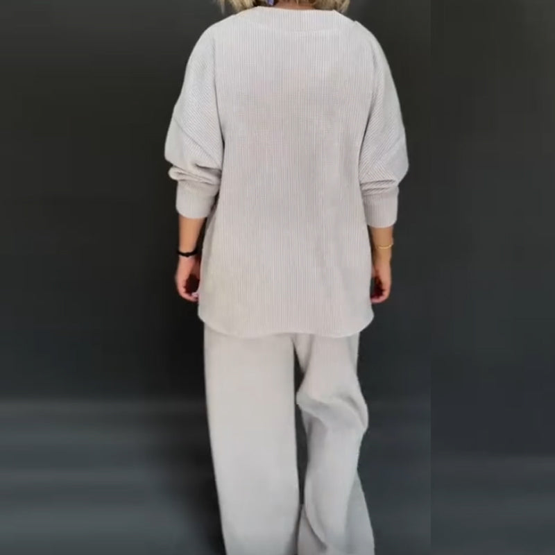 MIĘKKA TKANINA ŻEBROWANA - Zapewnia delikatność i przytulność w dotyku, gwarantując najwyższy komfort przez cały dzień. Subtelna faktura dodaje wizualnego uroku i wyrafinowania tej prostej, eleganckiej odzieży domowej.