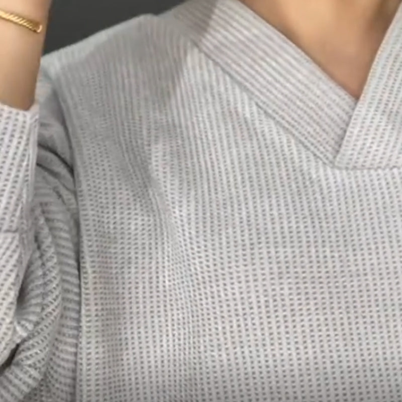 ELEGANCKI DEKOLT W KSZTAŁCIE LITERY V - Tworzy elegancki, wydłużony wygląd, który podkreśla linię szyi. Ten klasyczny detal dodaje wyrafinowania, dzięki czemu bluzkę można łatwo dopasować do różnych stylizacji za pomocą dodatków.