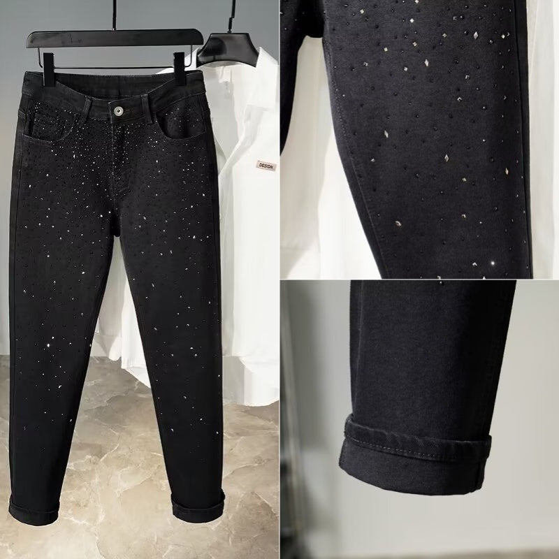 1 x Czarne jeansy slim fit z ozdobnymi kryształkami