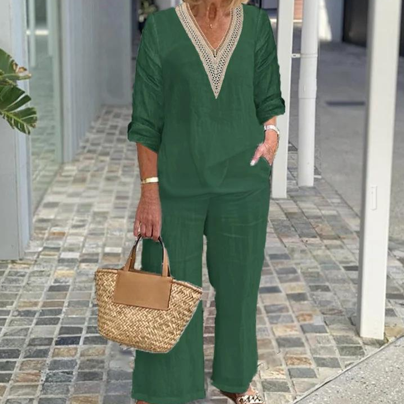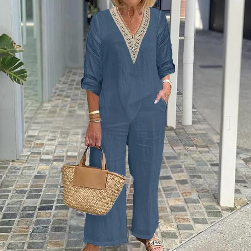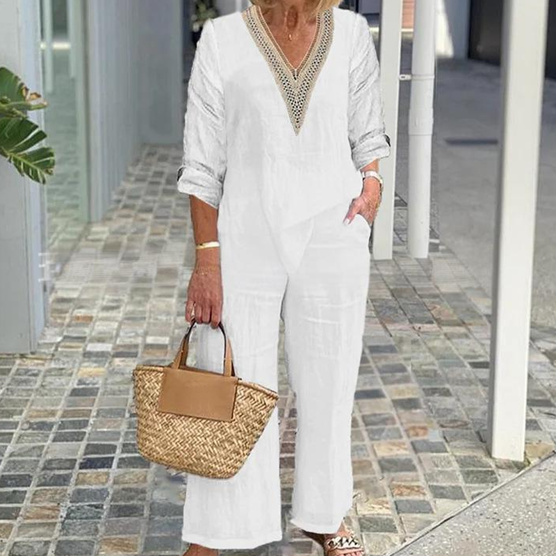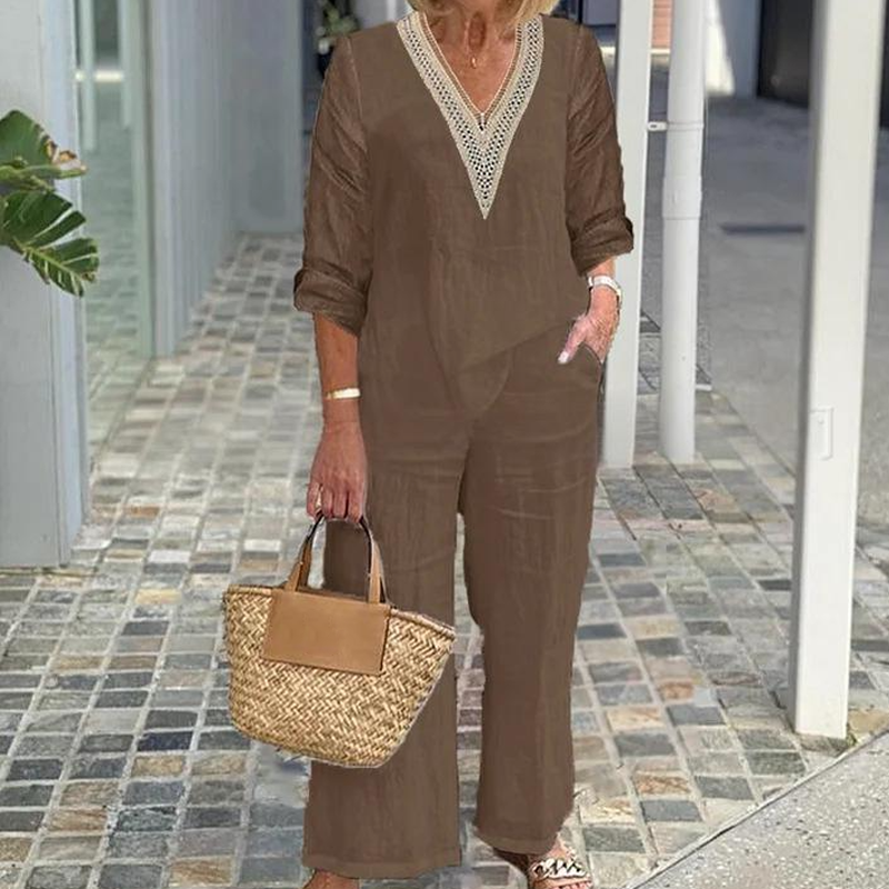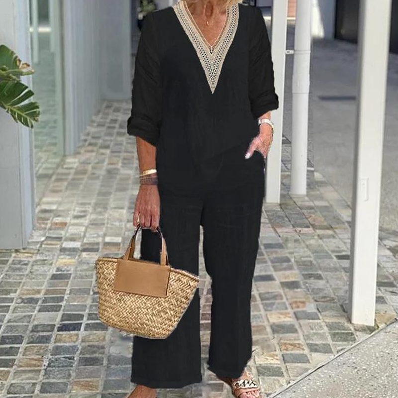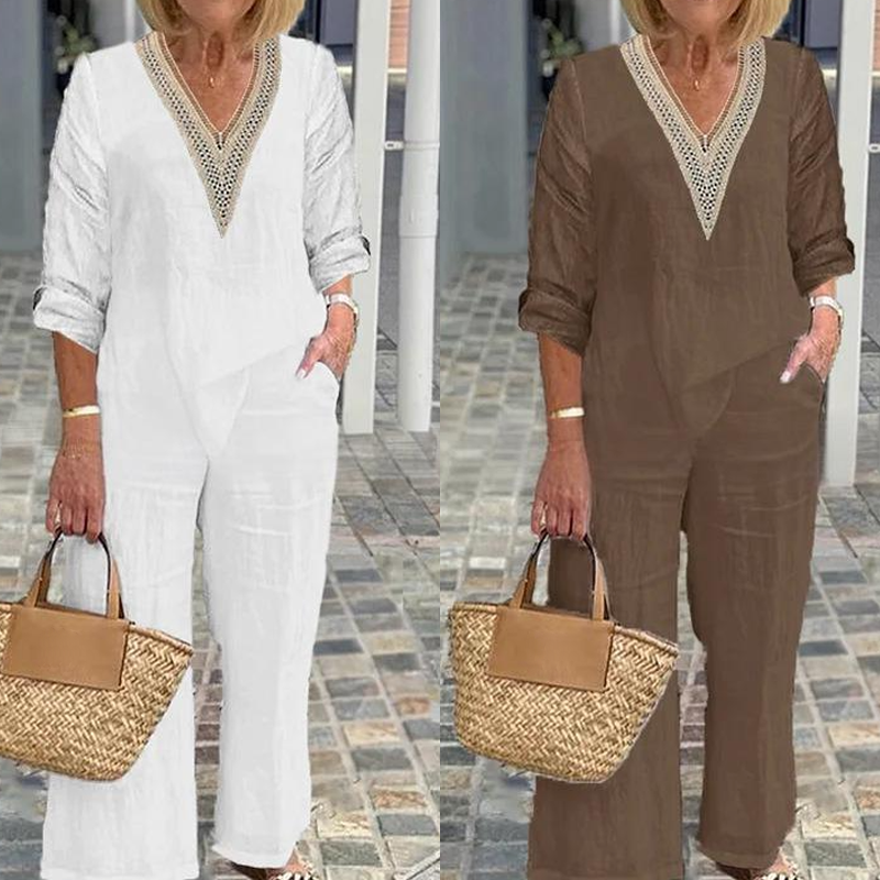 Zestaw zawiera: 1 * Damska bluzka z dekoltem w szpic i spodnie z szerokimi nogawkami