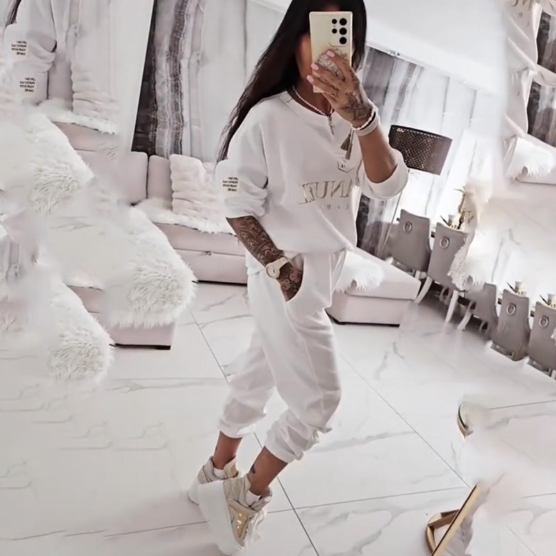 STYLOWA SCENOGRAFIA - Ten zestaw damski z bluzką z długim rękawem i spodniami ma luźny krój i podkreśla atuty sylwetki. Dzięki dopasowanemu fasonowi łatwo stworzyć elegancki, swobodny look, idealny na różne okazje i dla różnych typów sylwetki.