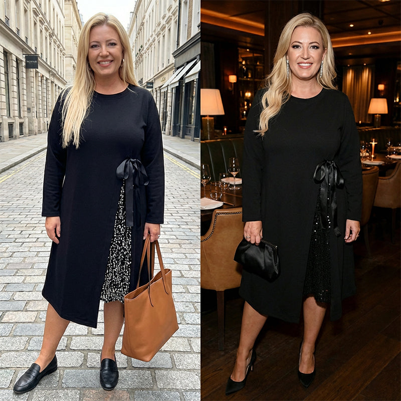 BŁYSZCZĄCY PANEL Z PAJETKAMI: Dodaje odrobinę blasku i pięknie odbija światło, dzięki czemu wyróżnisz się na każdym spotkaniu. Ten elegancki detal z łatwością podnosi rangę sukienki z casualowej do szykownej na każdą okazję.