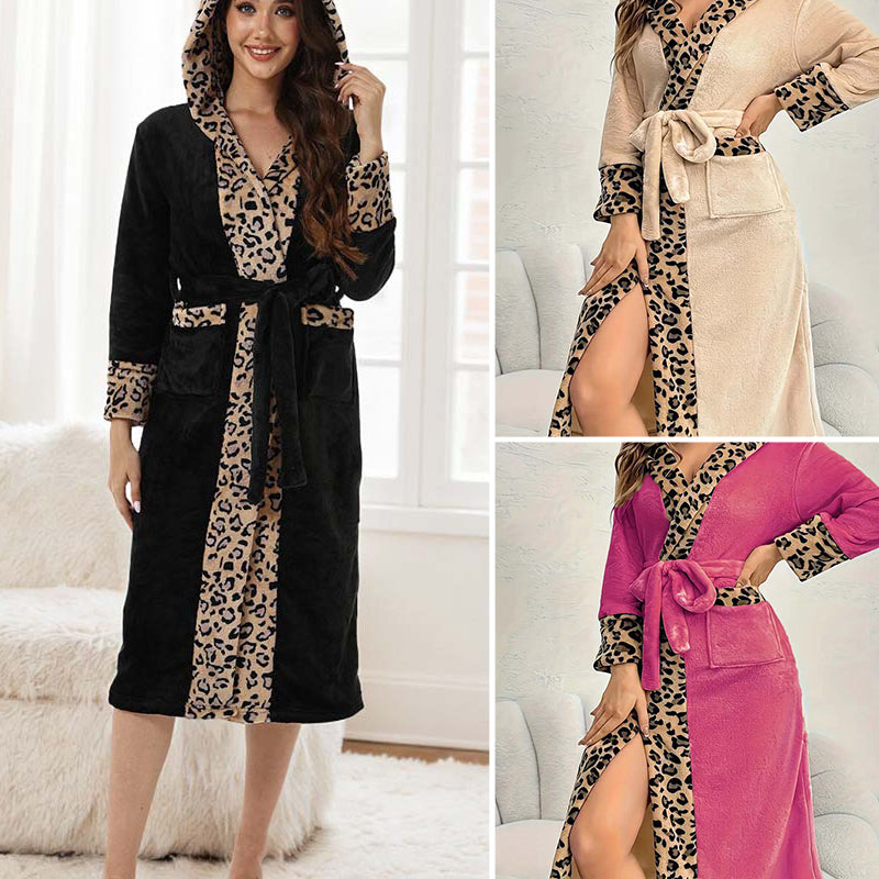 MODNY WZORNICTWO: Ten szlafrok charakteryzuje się nowoczesnym wzornictwem z kontrastującym wykończeniem w panterkę. Ten elegancki wzór podkreśla klasyczną sylwetkę, zapewniając atrakcyjny wygląd odpowiedni do relaksujących okoliczności.