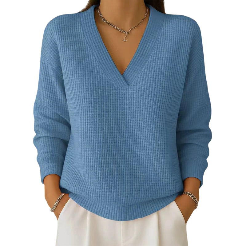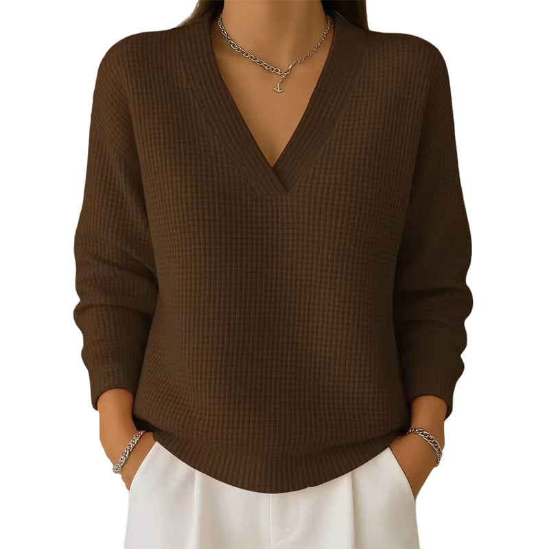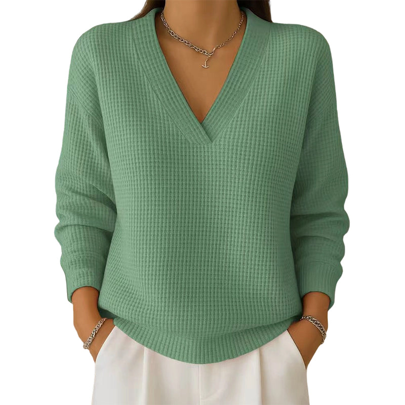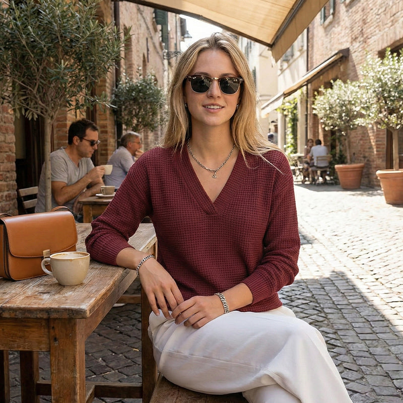 WAFLOWA STRUKTURA DZIANINY — Podnieś poziom swojego codziennego stylu dzięki wyjątkowej fakturze materiału. W przeciwieństwie do płaskich, gładkich dzianin, ten wzór dodaje wizualnej głębi i nowoczesnego charakteru, zapewniając Ci wyrafinowany, przytulny wygląd, który wyróżni Cię z tłumu.